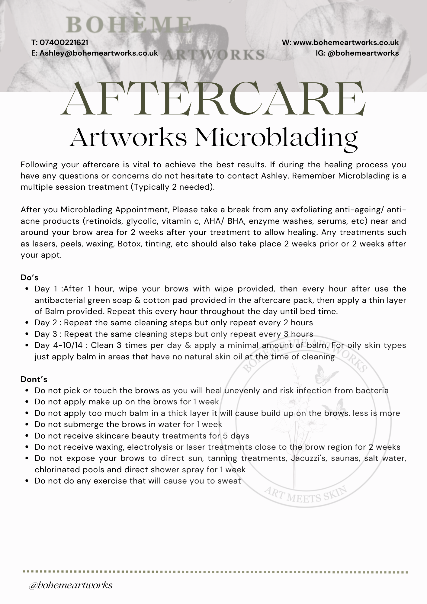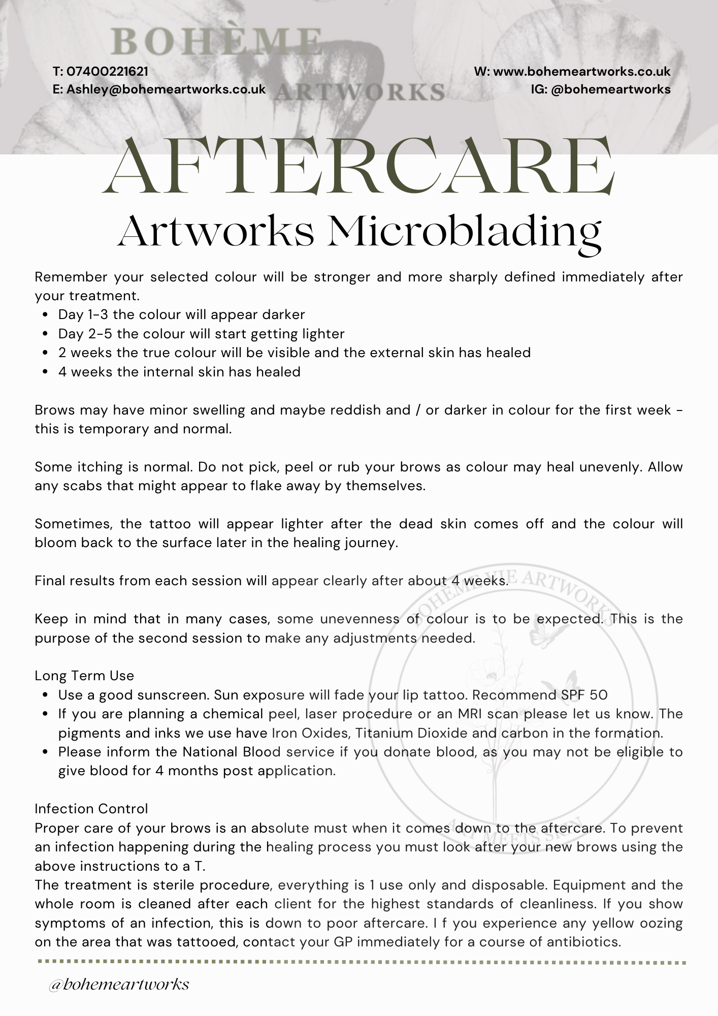 On the day of your treatment I will run through your aftercare process again and we will book your essential top up appointment in (this is the second half of the treatment) and is done 8-12 weeks after the initial treatment. This is an opportunity to refill any areas of the brow which may have faded over this period and make any adjustments needed to the shape and colour. Aftercare is the same post 2nd top up appointment.