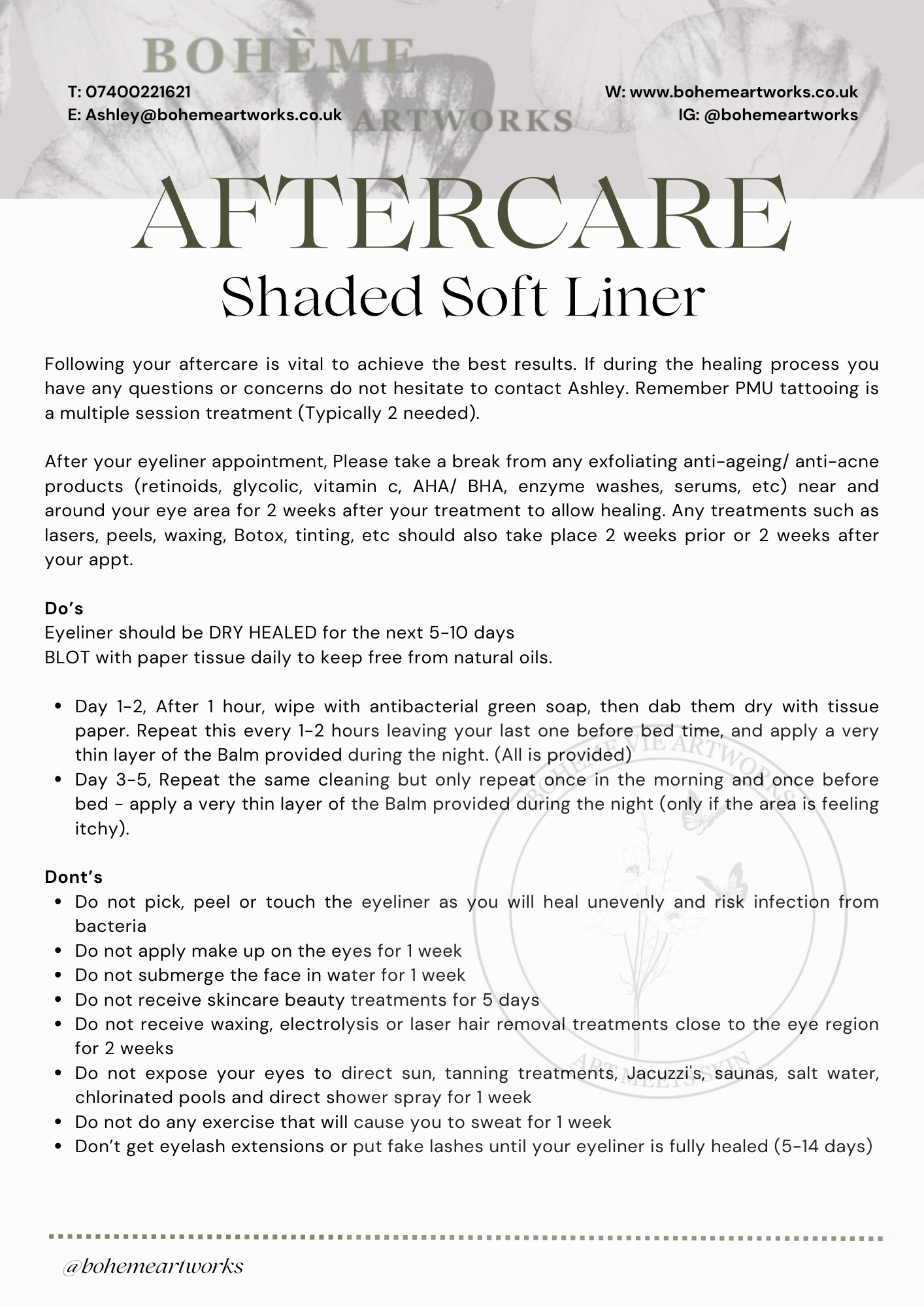 At Boheme Artworks, we pride ourselves on our skills, quality and experience that we bring to our clients, and we believe the quality of our work and clients results truly reflect that. Ashley, your Artist will be carrying out your treatment. Ashley has performed hundreds of treatments and is well known for creating super natural and hyper realistic results. Semi Permanent Make up Treatments are intended to enhance your natural features, using the highest quality of pigments / ink and tools for optimal, long lasting healed results.